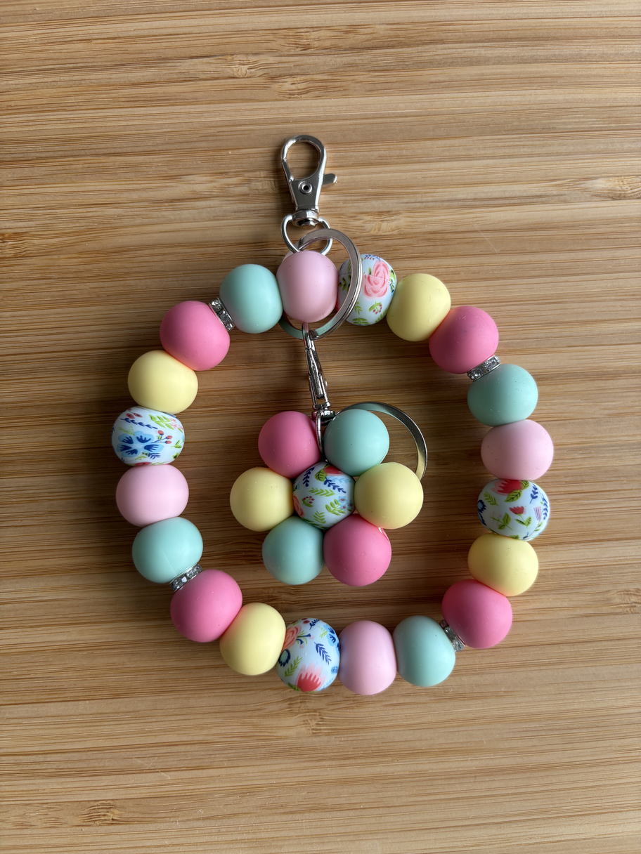 Deze set bestaat uit een prachtige wristlet en bloemsleutelhanger. Een wristlet is handig om je sleutels snel terug te vinden in je tas.